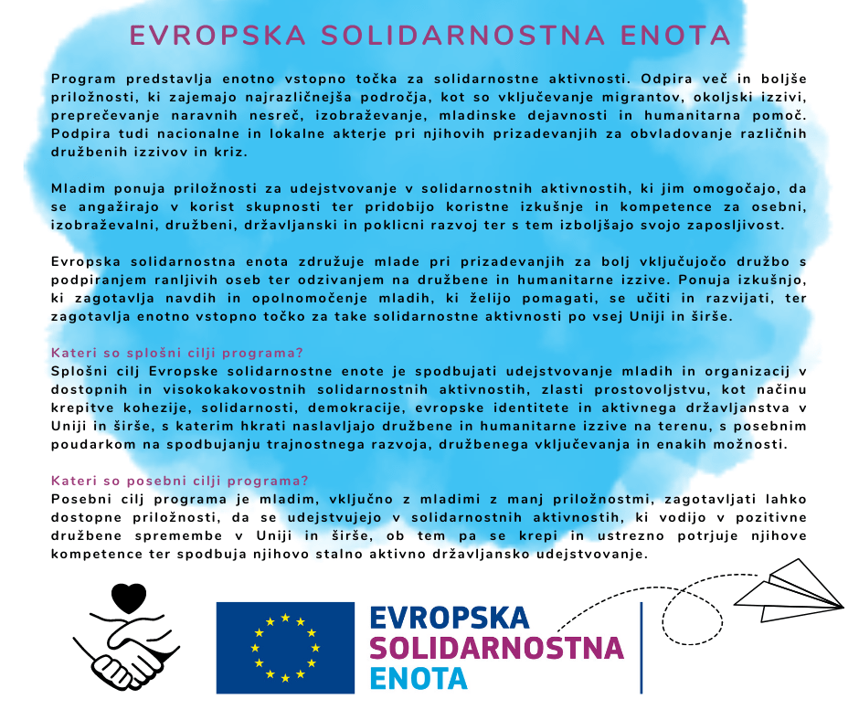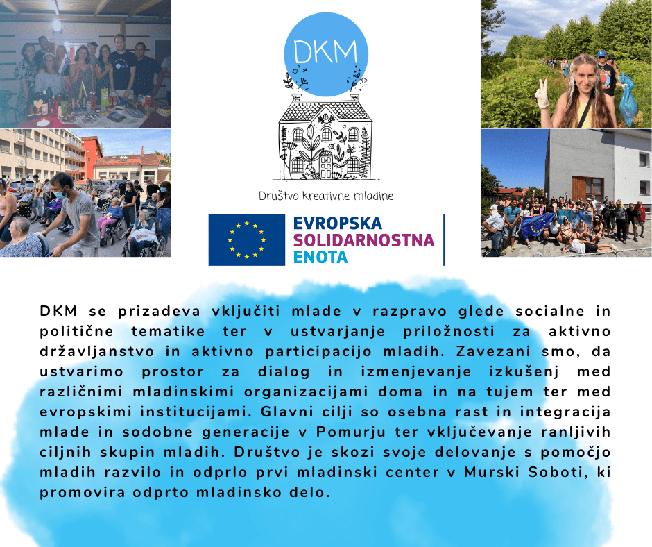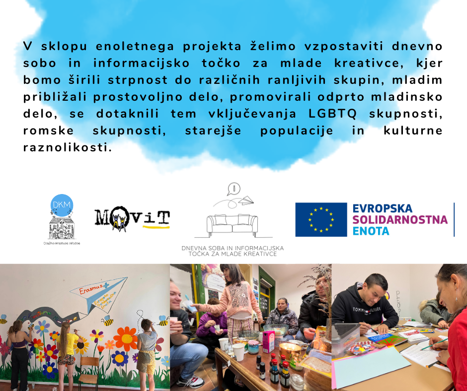 V sklopu enoletnega projekta smo začeli z vzpostavitvijo mladinskega centra “DNEVNA SOBA IN INFORMACIJSKA TOČKA ZA MLADE KREATIVCE”, kjer je glavni namen promocija strpnosti do različnih ranljivih skupin, mladim približati prostovoljno delo, promovirati odprto mladinsko delo, se dotakniti tem vključevanja LGBTQ skupnosti, romske skupnosti, starejše populacije in kulturne raznolikosti.
