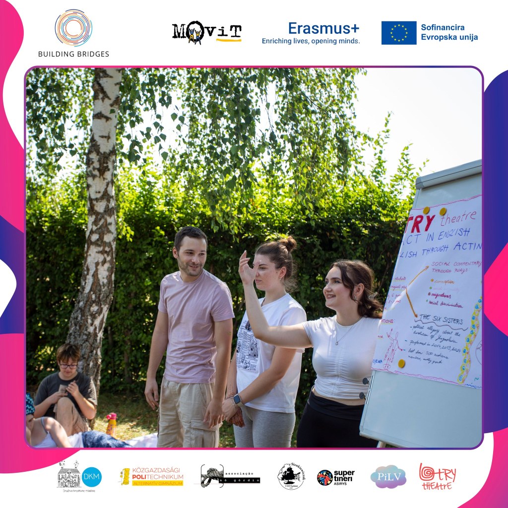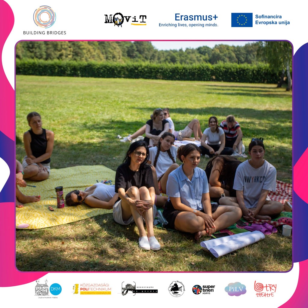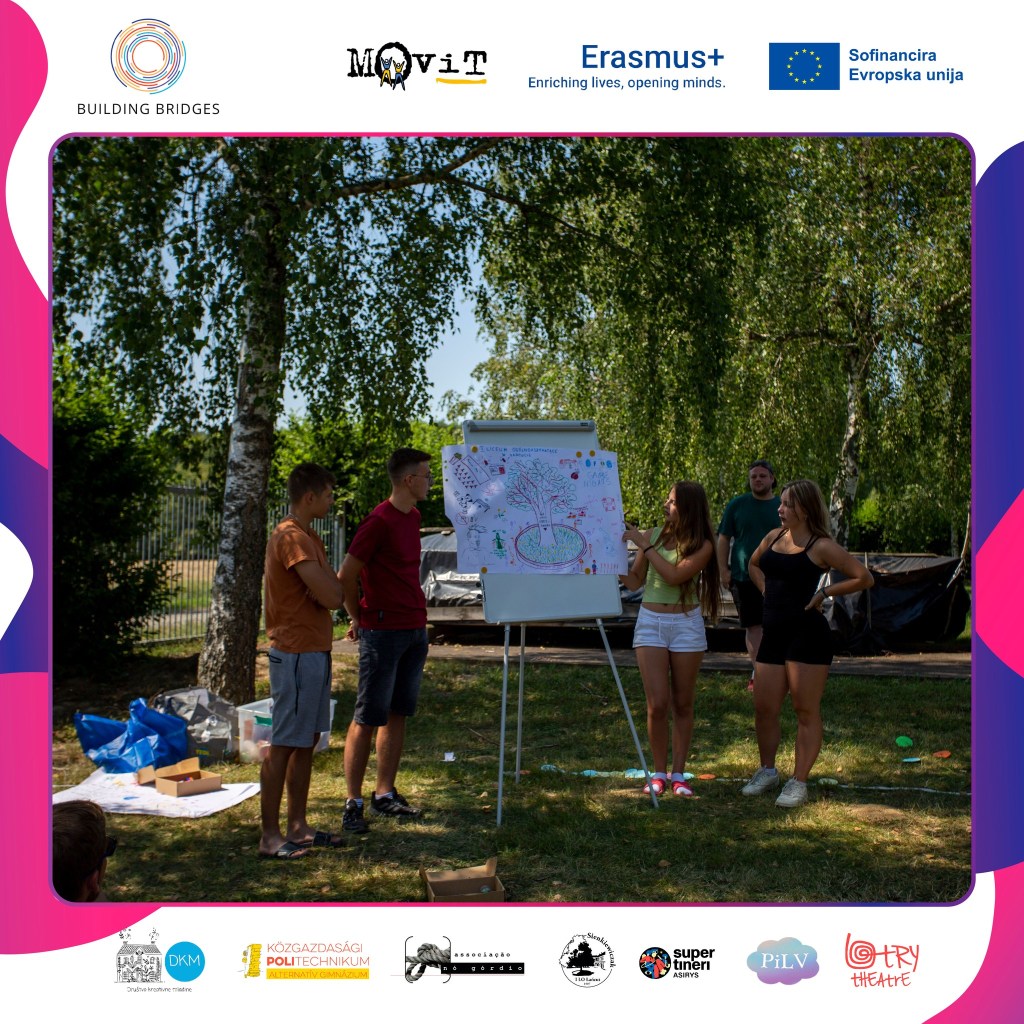 EN | A day at the youth exchange titled “Building Bridges” was very eventful and educational. Participants started the day with an energizer, followed by a timeline activity where they shared their experiences and work in volunteering, arts, and personal matters. Then, they presented their sending organizations, allowing us to learn about the partners involved in the project. In the afternoon, we identified vulnerable target groups, presented them, and developed a debate. This helped us better understand these groups in the following days when we visited them in Murska Sobota. The project is co-funded by the Erasmus+ Youth program and the Slovenian National Agency Movit.