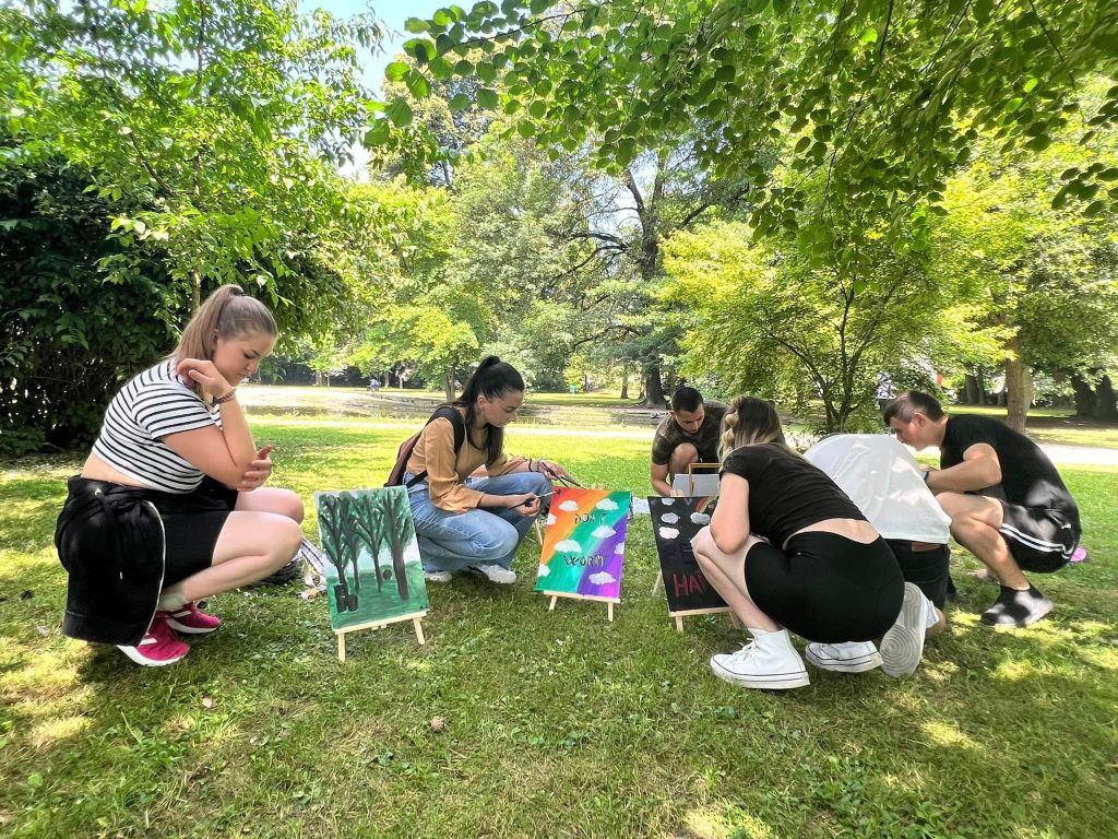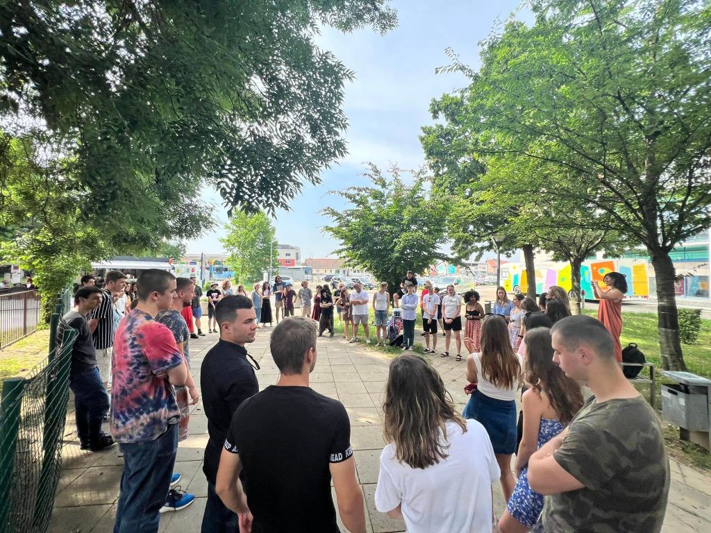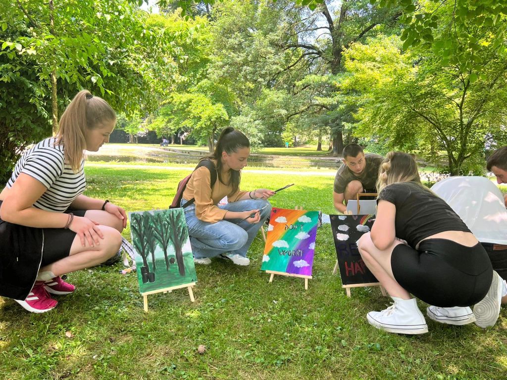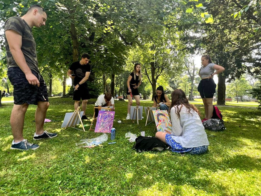 V sredo smo v sklopu mladinske izmenjave “Bližina-distance no more” obiskali Mursko Soboto in Dnevno sobo in informacijsko točko za mlade kreativce. Skupaj smo pripravili Erasmus+ dan, kjer smo po Murski Soboti na različnih lokacijah izvedli različne kreativne delavnice. V parku sta dve skupini ustvarjali na platnu, v naši Dnevni sobi sta dve skupini risali po stenah, ena skupina je ustvarjala drevo pozitivnih mislih in ena skupina je ustvarjala foto točko, ki smo jo izobesili na našem velikem oknu. Dve skupini pa sta se podali po mestu, kjer sta delili pozitivne misli in vabila na našo zaključno predstavo.