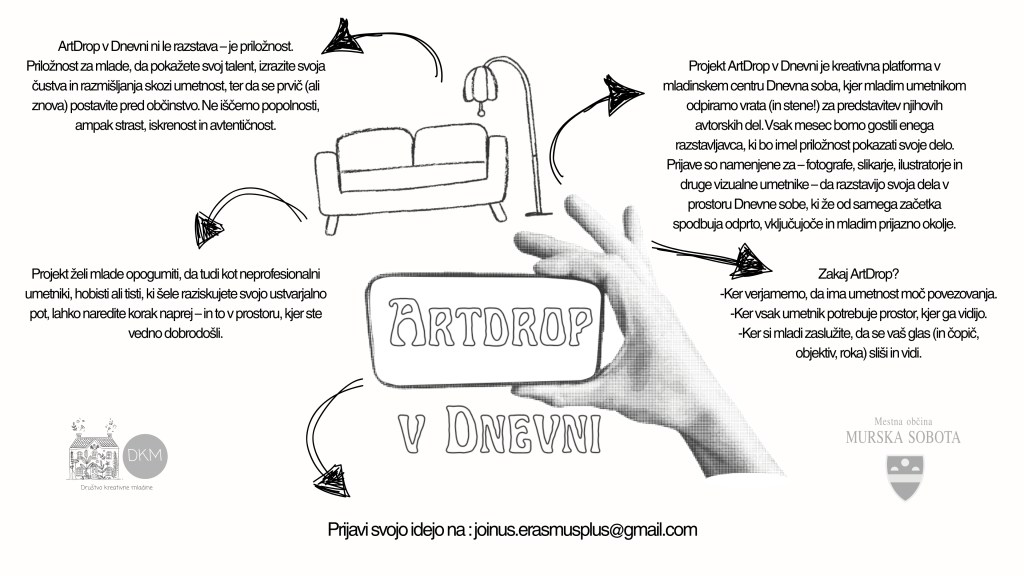 Projekt ArtDrop v Dnevni je nova kreativna platforma v mladinskem centru Dnevna soba, kjer mladim umetnikom odpiramo vrata (in stene!) za predstavitev njihovih avtorskih del. Vsak mesec bomo gostili enega razstavljavca, ki bo imel priložnost pokazati svoje delo. Prijave so namenjene za – fotografe, slikarje, ilustratorje in druge vizualne umetnike – da razstavijo svoja dela v prostoru Dnevne sobe, ki že od samega začetka spodbuja odprto, vključujoče in mladim prijazno okolje.
